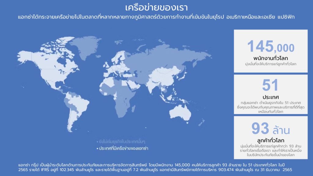 กลุ่มแอกซ่า ดำเนินธุรกิจใน 57 ประเทศ โดยมีพนักงานและฝ่ายขายกว่า 121,000 คน มุ่งมั่นที่จะให้บริการแก่ลูกค้ากว่า 105 ล้านรายทั่วโลก