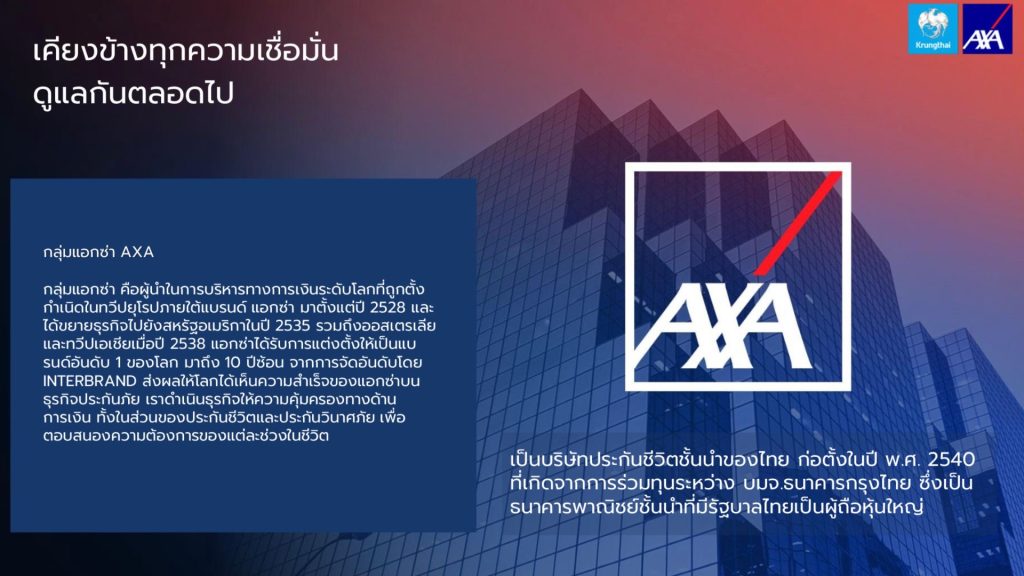 เกิดจากการผนึกกำลังของ บมจ. ธนาคารกรุงไทย ธนาคารพาณิชย์ชั้นนำของไทย และกลุ่มแอกซ่า กลุ่มธุรกิจประกันชีวิต สุขภาพและบริหารสินทรัพย์ระดับโลก