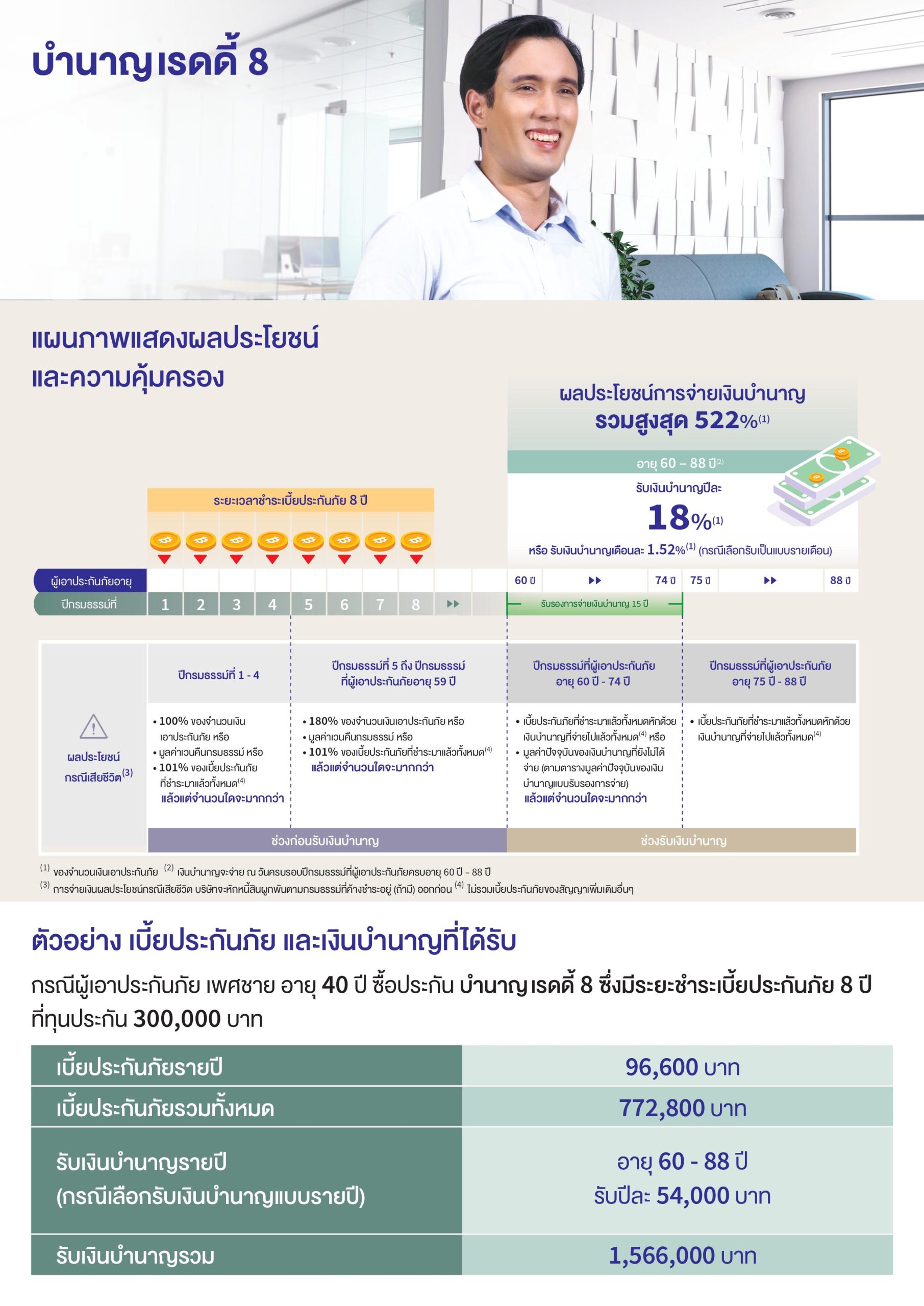 รับเงินบำนาญปีละ 18% ตั้งแต่อายุุ 60-88 ปี รวมเงินบำนาญตลอดสัญญา 522% (%ของจำนวนเงินเอาประกันภัย)