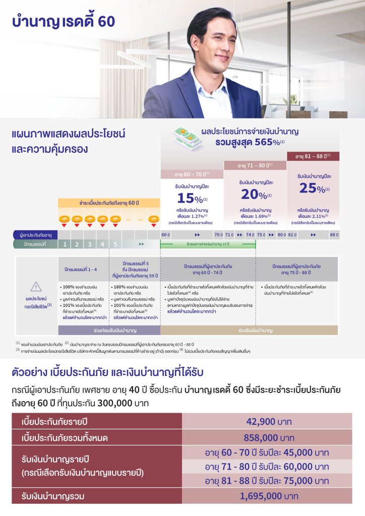 รับเงินบำนาญตั้งแต่อายุุ 60-88 ปี สูงสุดปีละ 25% รวมเงินบำนาญตลอดสัญญา 565% (%ของจำนวนเงินเอาประกันภัย)