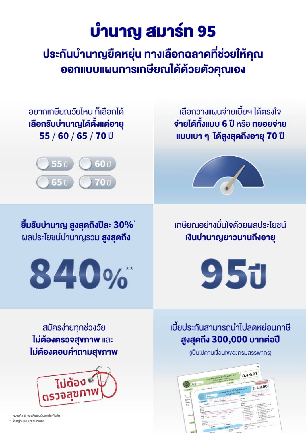 รับเงินบำนาญยาวนานถึงอายุ 95 ปี สูงสุดปีละ 30% ของจำนวนเงินเอาประกันภัย รวมสูงสุดถึง 840% ของจำนวนเงินเอาประกันภัย (ขึ้นอยู่กับแผนประกันที่เลือก)